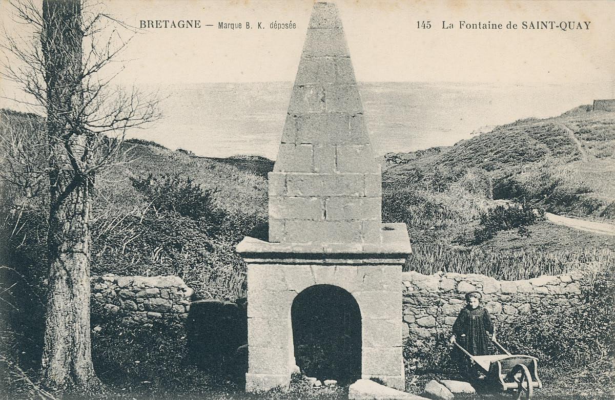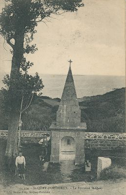 La source miraculeuse qui aurait guéri les blessures de saint Quay a toujours été vénérée localement. Les habitants s’y rendaient pour les vertus curatives de son eau. Un premier édifice de 1580, tombé en ruines, a été remplacé en 1862 par celui-ci, édifié grâce au recteur de l’époque, l’abbé Gicquel. L’histoire de saint Quay est gravée sur son côté. Aujourd’hui, l’association Amicale des Moulin, Fontaines, Lavoirs, l’entretient régulièrement.