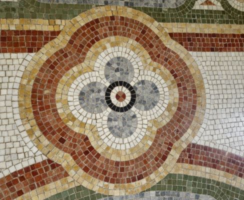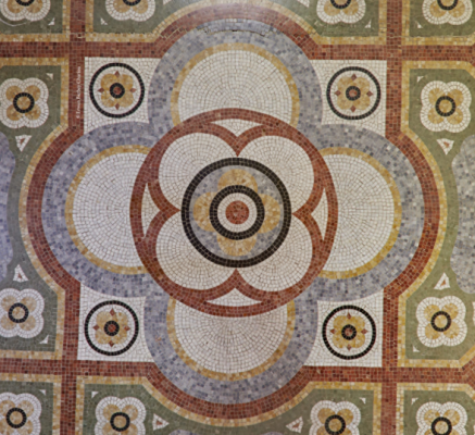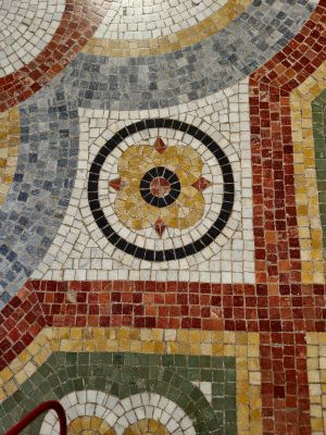Vous pouvez voir en vidéo le magnifique décor du hall d’entrée : multiples quadrilobes emboîtés d’une grande richesse chromatique (brun-rouge, jaune-ocre, bleu-vert, noir, gris sur fond blanc) qui compense le manque de lumière dans ce hall.